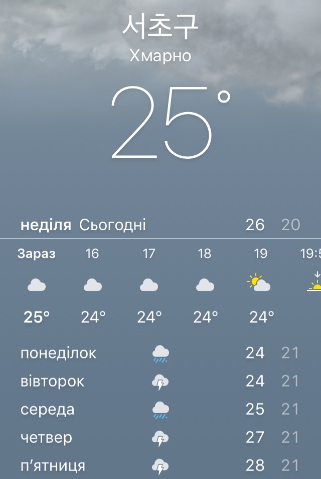 Від початку нашого перебування в Кореї сонячних днів не було, що сприяє швидкій і комфортній адаптації до нового клімату. Температура коливалась в межах 20-25 градусів. Повітря надзвичайно вологе. Також, присутні короткотривалі зливи.