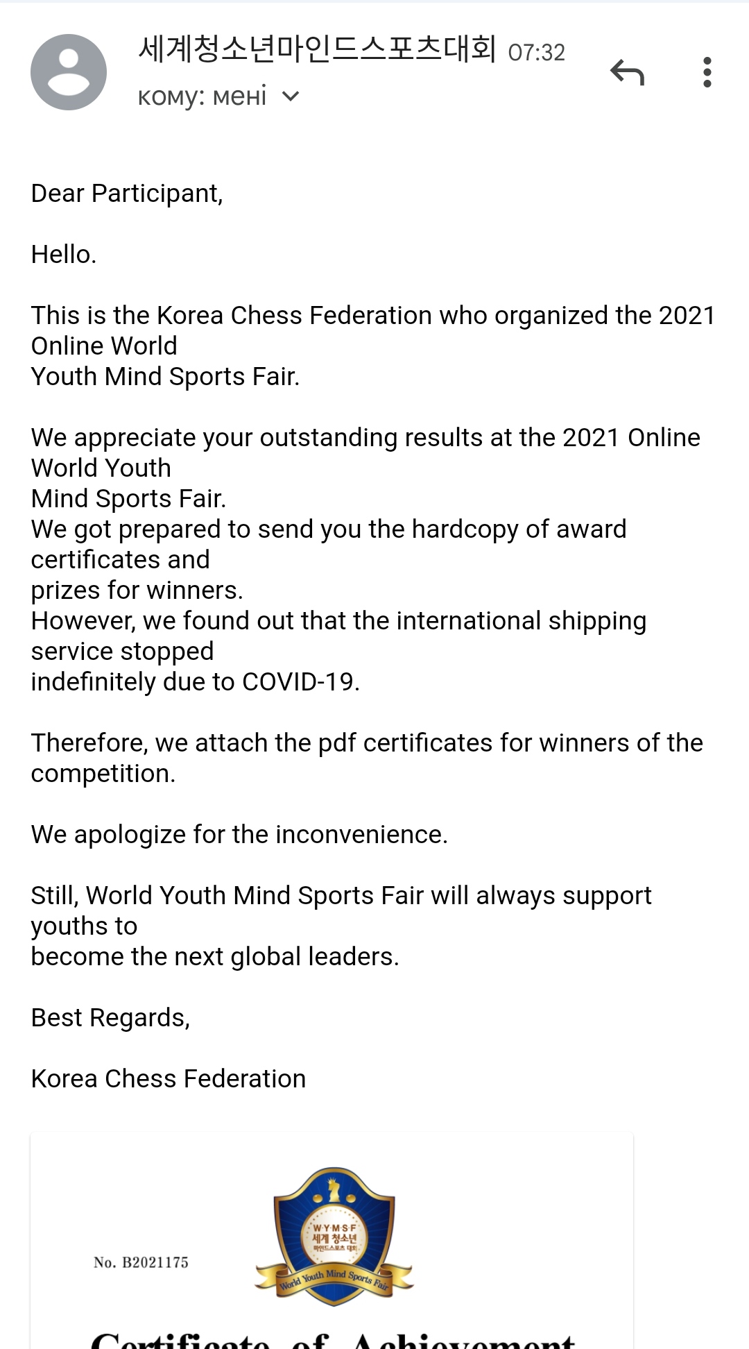 Ні, на жаль, ця їхня шахова федерація якась не надто відповідальна, вочевидь. В першому таком турнірі діти брали участь ще взимку. Теж мали бути сувеніри. Тоді написали - ковід, надішлемо, як будуть сприятливі умови. Після того, як Всеволоду влітку прийшла посилка з Кореї (висилали штатив перед кубком Прем'єр Міністра), а також було оголошено про даний турнір повторно, я написала їм листа і чемно запитала, чи не хочуть вони надіслати нам обіцяні призи. Відповіді я не отримала, натомість нові призери знову не отримали своїх призів :unsure: