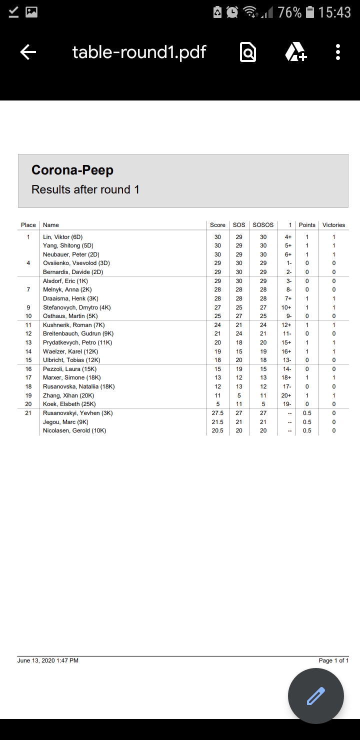 1 Bernardis, Davide (2D) Lin, Viktor (6D) 6.5 1-0