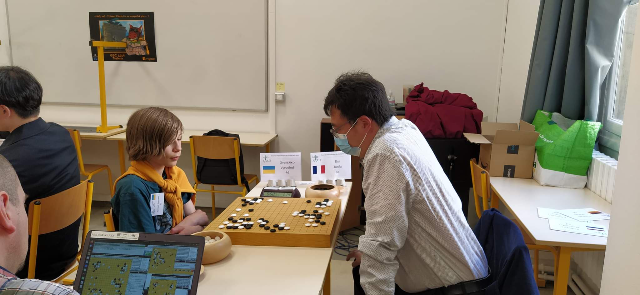 Слова щирого захоплення на адресу Валерія Крушельницького почула ще у перший день змагань від Чемпіонки Франції Мілени Бокле. Наш Чемпіон України і Європи вранці скромно допоміг організовувати місце змагань, а у другому турі отримав перемогу над одним із найсильніших суперників, Кім Дойюп. Трансляції партій доступні впродовж двох тижнів на каналі твіч Єврогофедерації.