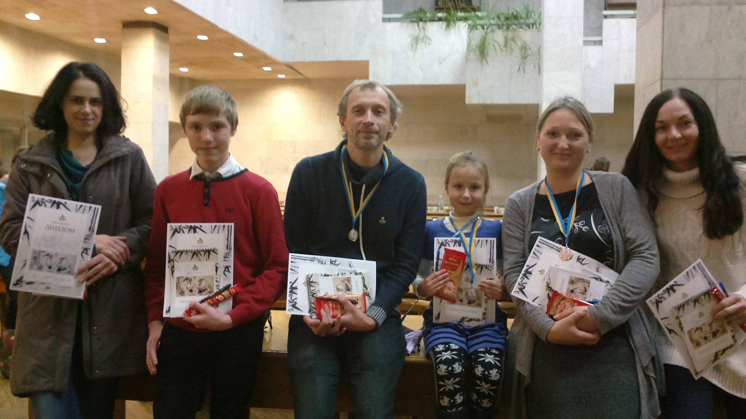 - ---------------- ---- ----- ------- -- -- --- -- -- -------- ----- -------- № Ім'я Клуб Ранг Рейтинг I II III IV V Перемоги кБерг Рейтинг₂ - ---------------- ---- ----- ------- -- -- --- -- -- -------- ----- -------- 1 Овсієнко, Андрій Київ 25 кю 50 5+ 3+ 2+ 4+ 6+ 5 10 (+25) 75 2 Сівер, Катерина Київ 25 кю 54 6+ 5+ 1- 4+ 3- 3 4 (+17) 71 3 Власенко, Влада Київ 24 кю 64 4- 6+ 5+ 1- 2+ 3 4 (+17) 81 4 Сівер, Тетяна Київ 25 кю 58 3+ 1- 6+ 2- 5+ 3 4 (+17) 75 5 Легкий, Микита Київ 29 кю 16 1- 2- 4- 6+ 3- 1 0 (+9) 25 6 Громок, Олена Київ 29 кю 10 2- 4- 3- 5- 1- 0 0 (+5) 15Переміг Овсієнко Андрій, а Сівер Катерина, Власенко Влада та Сівер Тетяна поділили місця з другого по четверте і стали призерками у групі.